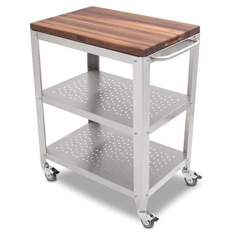 Ideal for providing extra work space, the Walnut Cucina Culinarte Kitchen Cart provides you with both storage space and an exceptional cutting board top. Made from edge grain walnut wood, the top of this cart is perfect for food preparation, while the stainless-steel shelves underneath let you store ingredients. With wheels for ease of movement and a towel bar, this cart makes a wonderful addition to any kitchen.