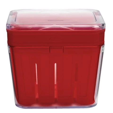 - Basket stores inside a clear plastic container with a lid to lock in freshness.