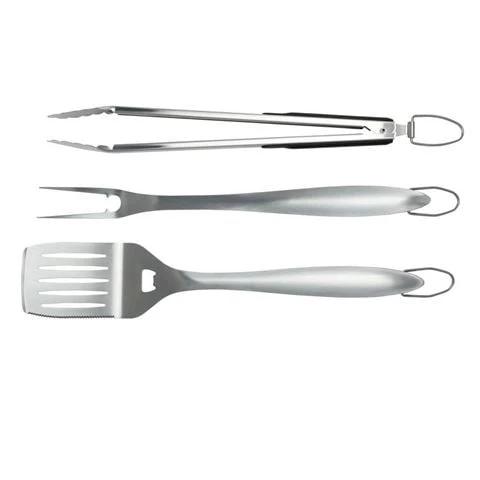 Become a barbecuing master with this Grande BBQ Set. The set includes a spatula, fork and tongs – the three essential BBQ tools. Every tool features a soft grip handle for comfort whilst cooking. Plus hanging hooks for easy storage. Crafted from durable stainless steel, these tools are perfect for flipping, turning and piercing.