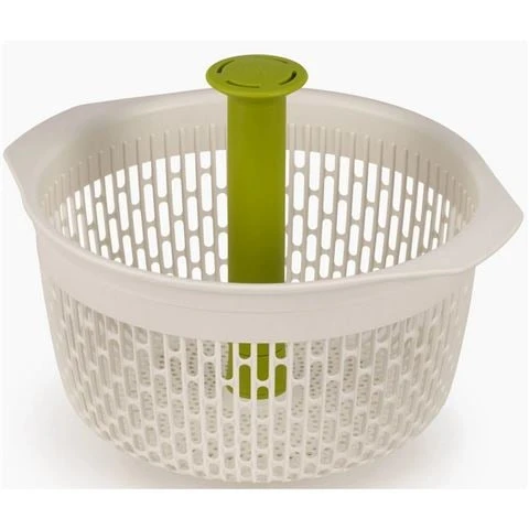 For preparing salads, attach the spindle and suction to the basket, add the food and rinse as normal under the tap. Next fix the colander to the base of the sink with the suction cup and then pump the spindle up and down to rotate the basket and expel excess water.