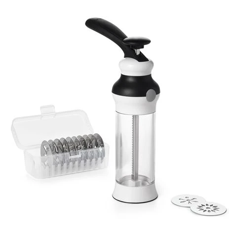 Make consistently shaped cookies with a simple pump of the large, comfortable lever. Disassembles for easy loading and cleaning. 12 stainless steel patterned disks included: Daisy, Flower, Sunflower, Fleur-de-lis, Butterfly, Bear, Shell, Leaf, Heart, Snowflake, Tree and Wreath.