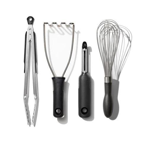 Prep with the best with this Oxo Good 4-Piece Oxo Good Grips , which has everything you need to prep and cook meals in the kitchen with these Oxo signature tools including a Swivel Peeler, Wire Potato Masher, Balloon Whisk and Tongs.