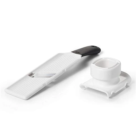 Oxo Good Grips Garlic Slicer has the problem solved. It makes easy work of slicing and keeping grip of slippery garlic cloves, creating even slices quickly and safely. It has a sharp, angled bi-directional stainless steel blade plus a food holder and plunger to contain garlic and protect hands while slicing. The textured ramp also prevents garlic from sticking. And of course, there’s the shaped, comfortable handle, which is what Good Grips is all about. Â