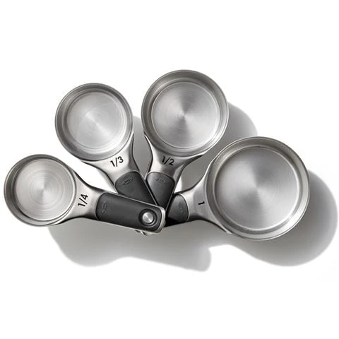 The Stainless Steel Measuring Cups Set are nested together with magnetic handles for easy storage. Designed to make measuring ingredients easier, they have measurements etched into the handles. They’re also soft and comfortable with non-slip grips.Â
